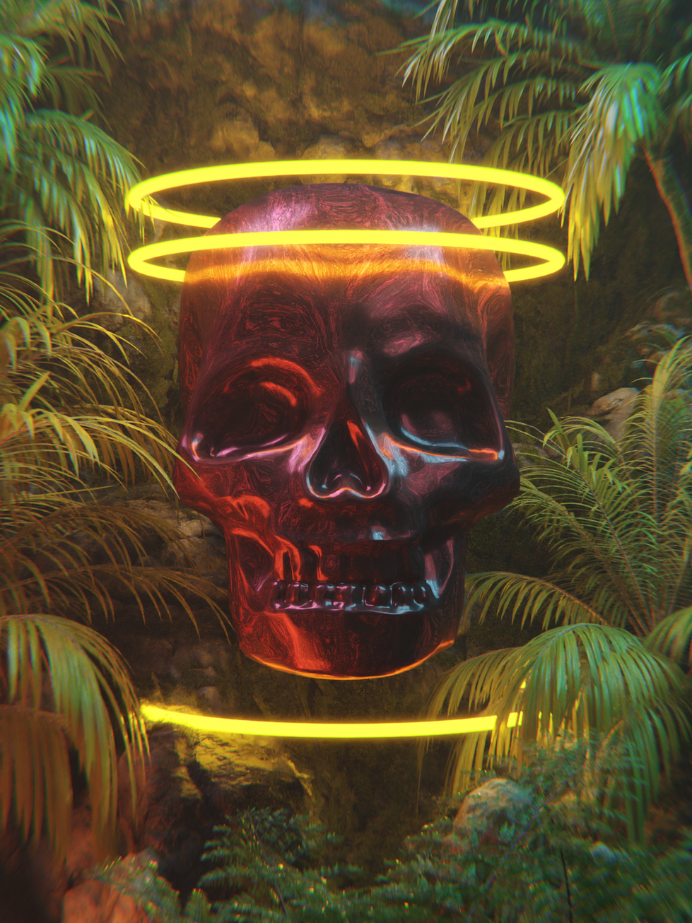 This work is inspired by the series "Epoch" by 3D artist Curtis Holt and the Police perfume "To Be Exotic Jungle". Originally, the skull was a 3D scan of exactly this perfume.