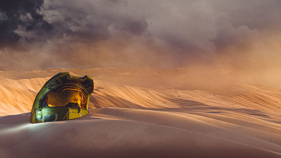 This scene was inspired by the ending of Halo Reach. The sand dunes were created procedurally in the material editor via displacement. The helmet is from the internet.